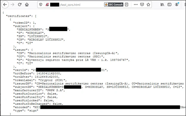 GoSignCoreĀ software (version 3.1.3, dated 2020-06-18) is a standalone e-signing application used to sign documents on Windows-based systems provided by theĀ State Enterprise Centre of Registers of Lithuania. The default installation runs a web service on the TCP port 8000 tied to the local host and is the main channel for qualified digital certificate retrieval and data signing. Because of an insecure configuration of CORS, a malicious website can interact with the GoSign web service and retrieve usersā personal information.