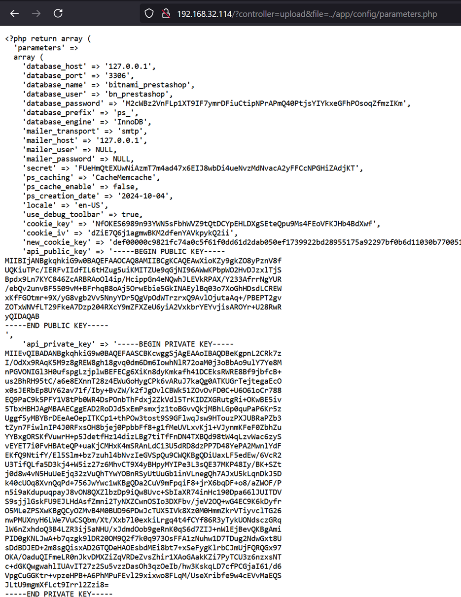 An authenticated attacker can further leverage the vulnerability to read the PrestaShop configuration file by visiting the following URL: